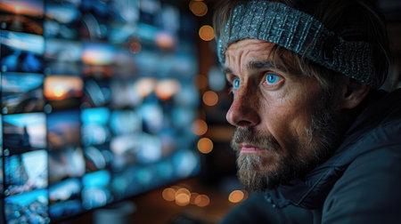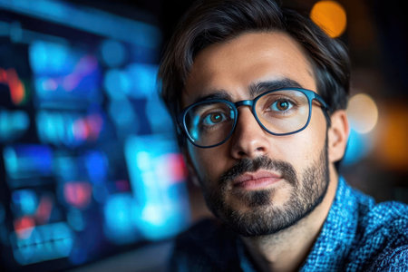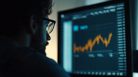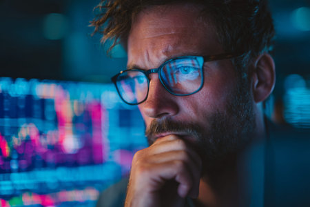 A serious trader exhibits intense concentration while studying market trends on a digital screen filled with financial data and charts, highlighting the world of finance.