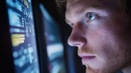 A young man sits in a dimly lit room, deeply focused on analyzing data displayed on his computer screen. The glowing monitor reflects on his face, emphasizing concentration.