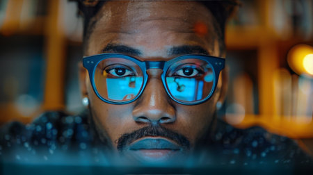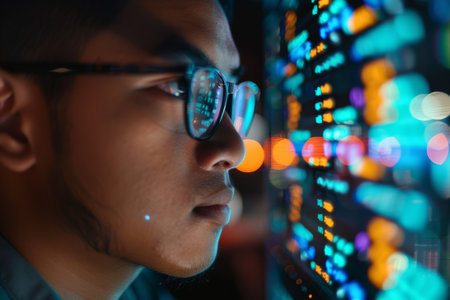 A young man with glasses focuses intently on analytical data displayed on a screen. The setting is a contemporary workspace illuminated by colorful lights in the evening.