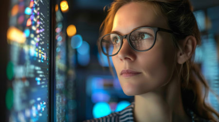 A focused woman with glasses examines vibrant data visualizations on a screen, symbolizing technology, analysis, and innovation in a digital environment.