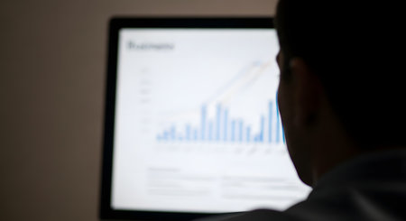 An over-the-shoulder, blurry shot of a man looking at a computer screen in a dark room. The screen displays a blurry blue and red bar graph and line chart, representing business analytics, stock market data, or financial growth.