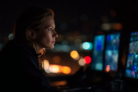 A woman intently observes numerous screens displaying various feeds in a control room. The night sky and city lights create a vibrant backdrop, enhancing her focused expression.