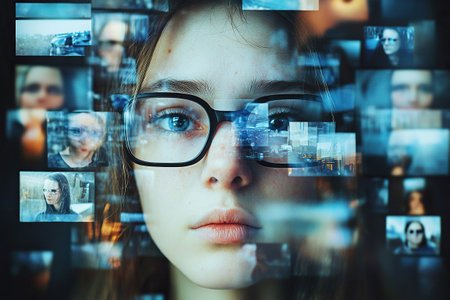 Double exposure with a woman wearing glasses and multiple screens with images. Concept of global connecting