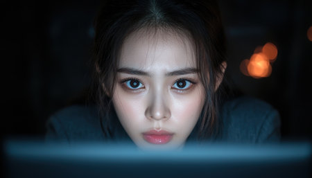 Intense gaze of a young woman in the dark