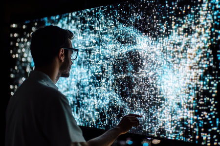 A professional engages with a bright digital display full of shimmering cosmic patterns in a lab.