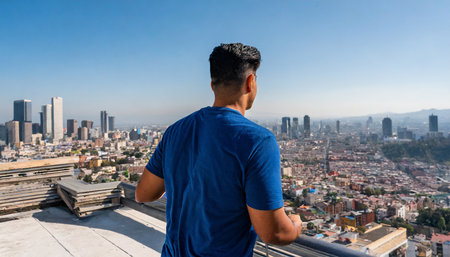 Young man with blue t-shirt looking at the cityscape.