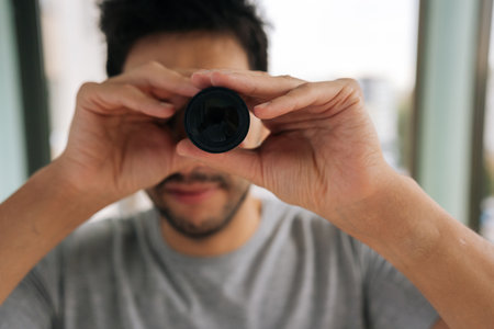 Close-up portrait of bearded man curiously peering out window using monocular, watching with emotion. Observing. Peeping through curtains. Maintaining vigilance.