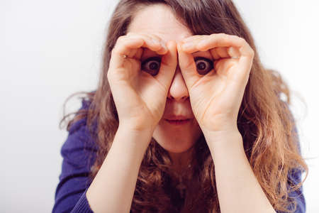 Woman looking through hands, making binoculars