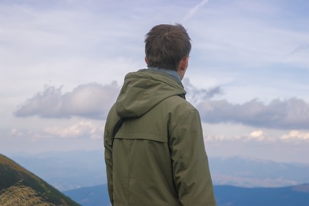 Young Man Traveler outdoor look at mountains