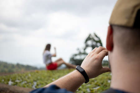 rear view of a man photographs on a smartphone, away girl in blur posing sitting. selective focus