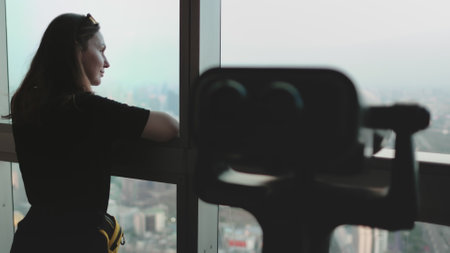 Woman gazes at the city from a skyscraper deck, exploring with binoculars. The skyline is a mix of modern buildings, creating a bustling metropolis under cloudy skies. Travel and adventure vibes