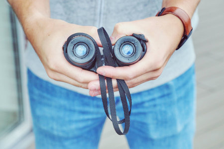 Midsection of a hipster with binoculars