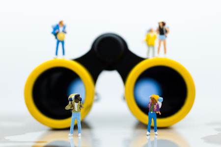 Miniature people: Travelers standing on a world map with binoculars. Image use for travel , business concept.