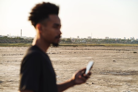 Picture of a handsome young african strong sports man using mobile phone outdoors.