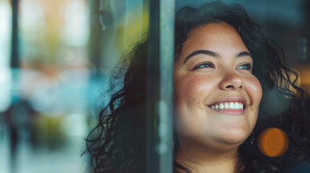 A happy chubby Latin Mexican female is smiling while looking out at the street from a window.