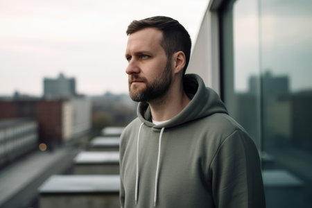 Young man hoodie watching city sunset from rooftop railing, contemplative mood