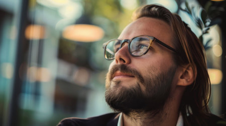 A man with long hair and glasses is standing and looking upwards. He appears focused and thoughtful as he gazes up into the distance.