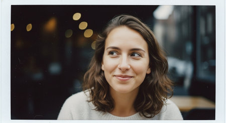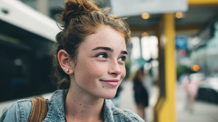 A teenage girl with visible blemishes and a messy bun smiles slightly while waiting at a city bus stop. The candid moment captures a modern and empowering vibe.