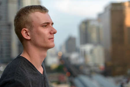 Portrait of young man with blond hair against view of the city