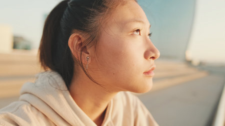 Close up, asian girl in sportswear stands at morning time on the sea background