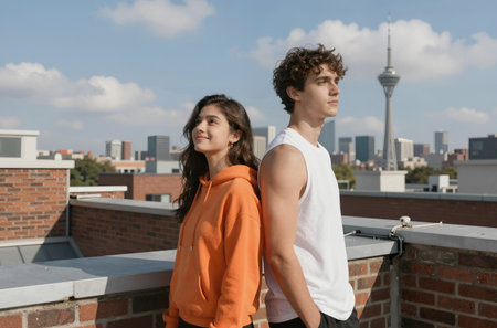 Young couple standing on the roof of a building, looking at the city