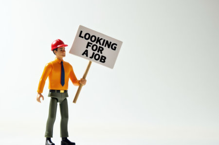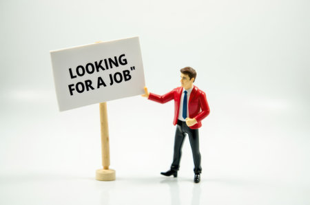 toy man holding a sign with the text (I'm looking for a job) on a white background