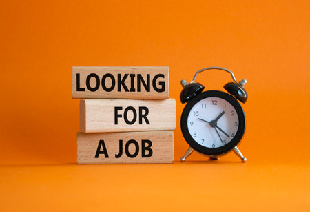 Looking for a job symbol. Concept words Looking for a job on wooden blocks. Beautiful orange background with alarm clock. Business and Looking for a job concept. Copy space.