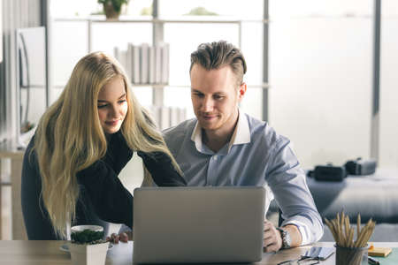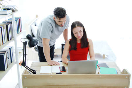 Young business man and woman working from home-office with morning sunshine. They are communicating in social network and searching information online.