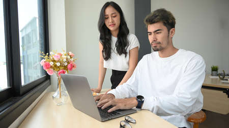 An Asian millennial man and woman collaborate on project campaign and marketing advertisement, working together in the office.