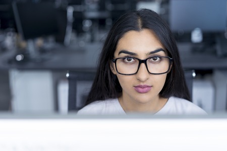 Portrait of a smiling young businesswoman sitting at a desk in the office