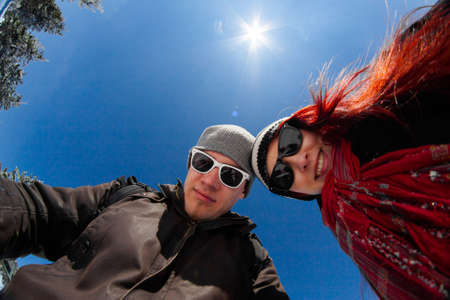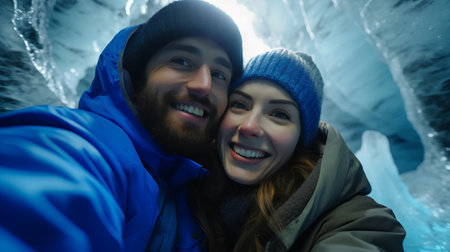 Couple in love taking a selfie in an ice cave. Winter holidays