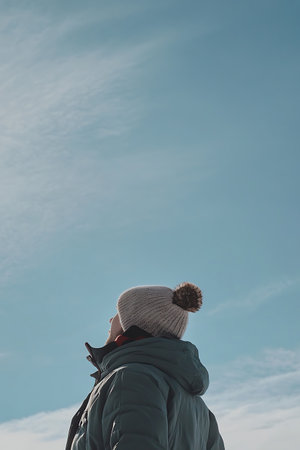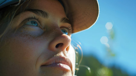 Upside Down Perspective of a Young Woman with Freckles Against a Bright Sky.