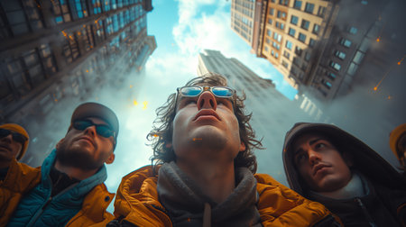Three people standing together in front of a blue sky, AI