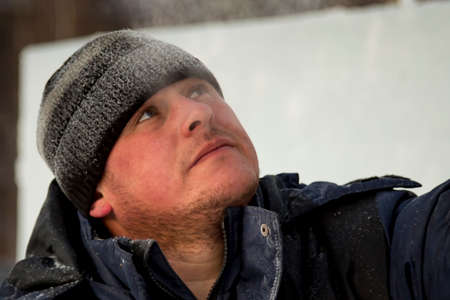 Portrait of a fitter in a blue jacket and a knitted hat at the frame of a wooden slide