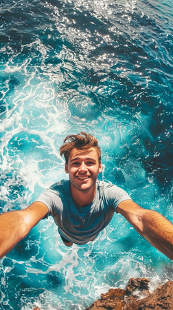 Male free diver taking a selfie while diving into the blue.