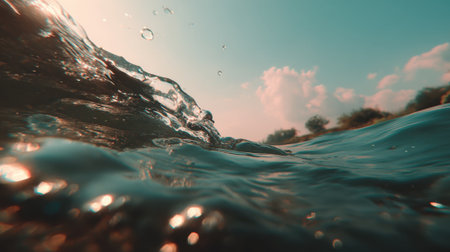 A unique low-angle view from beneath the waters surface, looking up at a cresting sea wave. The warm light of a sunset reflects on the water, with a soft-focus sky and distant shoreline.