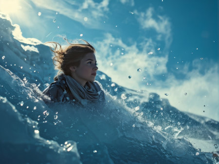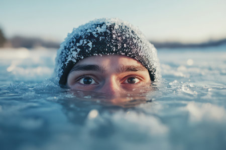 Humorous moment of a man bravely swimming in a frozen icy lake, showcasing winter sport adventure and extreme cold challenge.