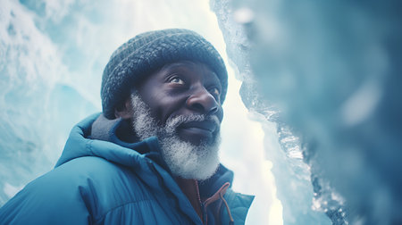 portrait of a young man in an ice cave in the winter