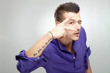 Portrait of a handsome young stylish man with beard taking photo on a vintage camera.