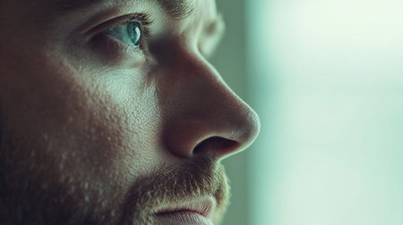 Close up profile of a thoughtful young man gazing out a window, bathed in soft, diffused light, evoking a sense of introspection and quiet contemplation