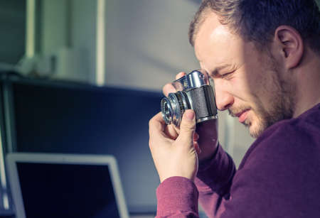 Hipster young man holding takes a picture with a vintage photo camera