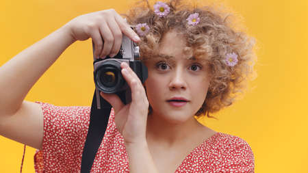 Charming girl holding a camera in her hands and taking a picture. Isolated over yellow background studio. Attractive girl dressed in pink top wearing flowers in her hair. Photography Concept.