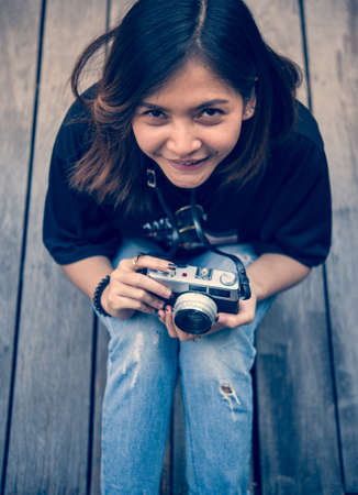 Hipster woman taking photos with retro film camera on wooden floorof city park,beautiful girl photographed in the old camera