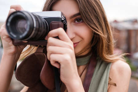 Lifestyle portrait of young photographer with vintage camera taking photo.