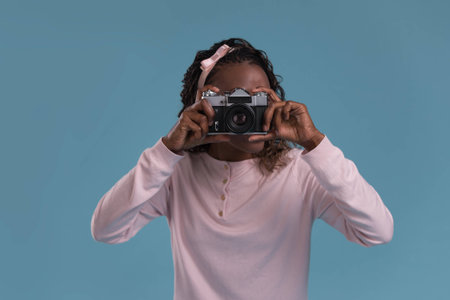 Beautiful young african woman using camera and photographing on blue background