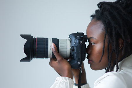 young afro american woman taking pictures with a large SLR camera in the studio on a white background