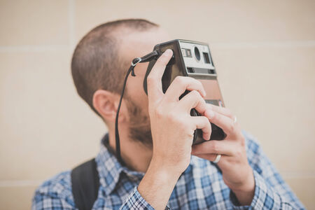Portrait of a handsome young stylish man with beard taking photo on a vintage camera.