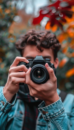 A creative photographer with curly hair is framing a shot of the vibrant, colorful foliage through the viewfinder of a professional dslr camera, immersed in the natural surroundings