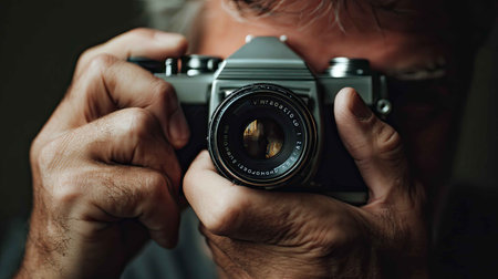 A close-up view of a photographer gripping a classic camera, prepared to capture a moment of creativity. The focus is on hands and lens, highlighting passion.