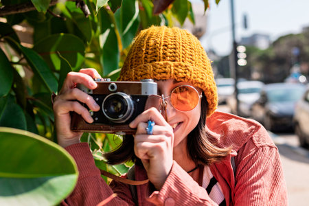 A young woman is using a vintage camera outdoor during daytime